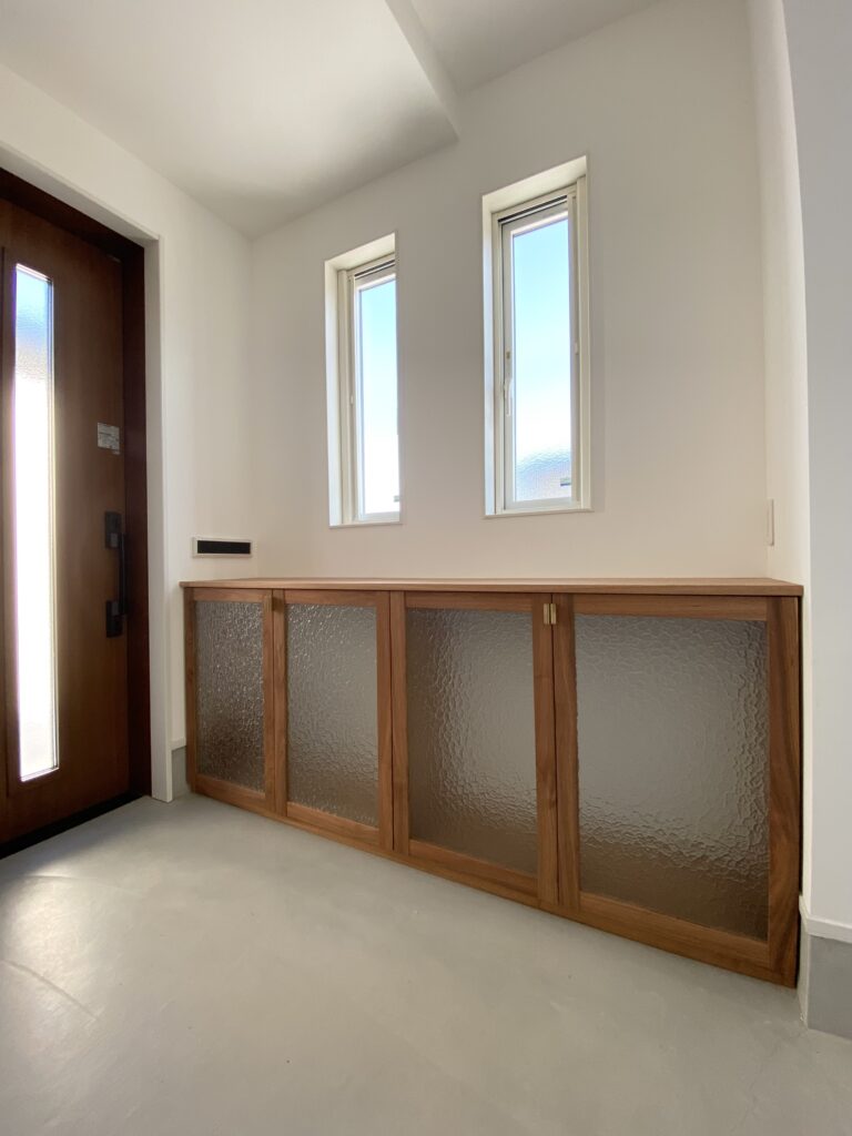 国産鬼胡桃の下足入とその対面の収納。