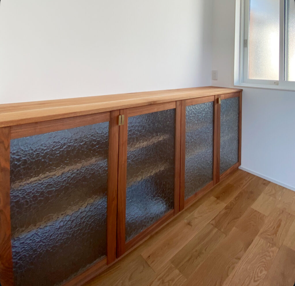 ガラス部分は既存のアルミサッシに使われていた、ステンドグラスに用いられるフランスのサンゴバン社の型板ガラスと思われるものを洗ってカットし、再利用しました。